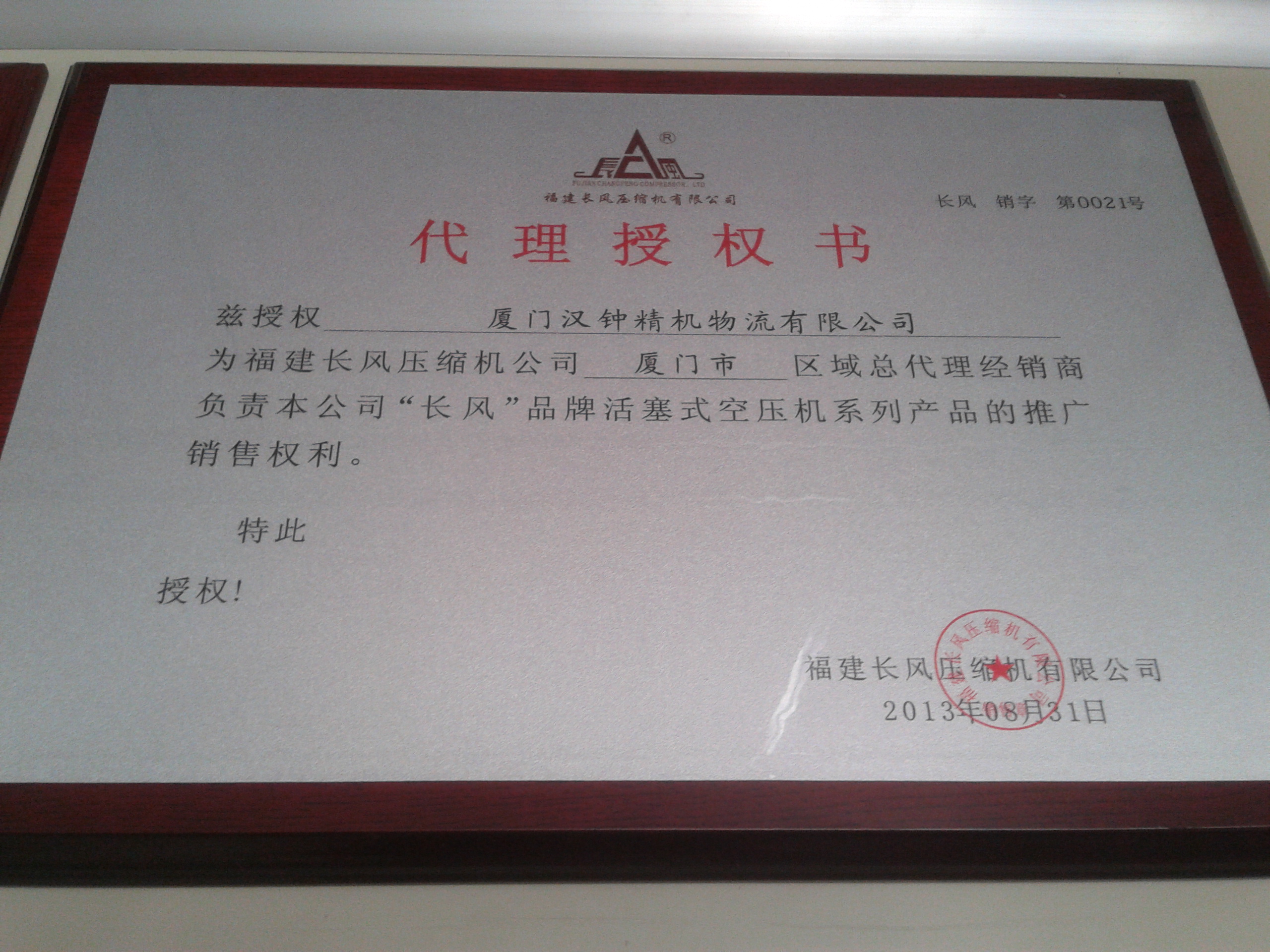 2013年8月福建建陽長風授權廈門漢鐘精機有限公司----總代理經(jīng)銷權