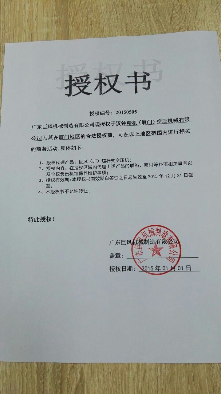 2013年8月福建建陽(yáng)長(zhǎng)風(fēng)授權(quán)廈門漢鐘精機(jī)有限公司----總代理經(jīng)銷權(quán)